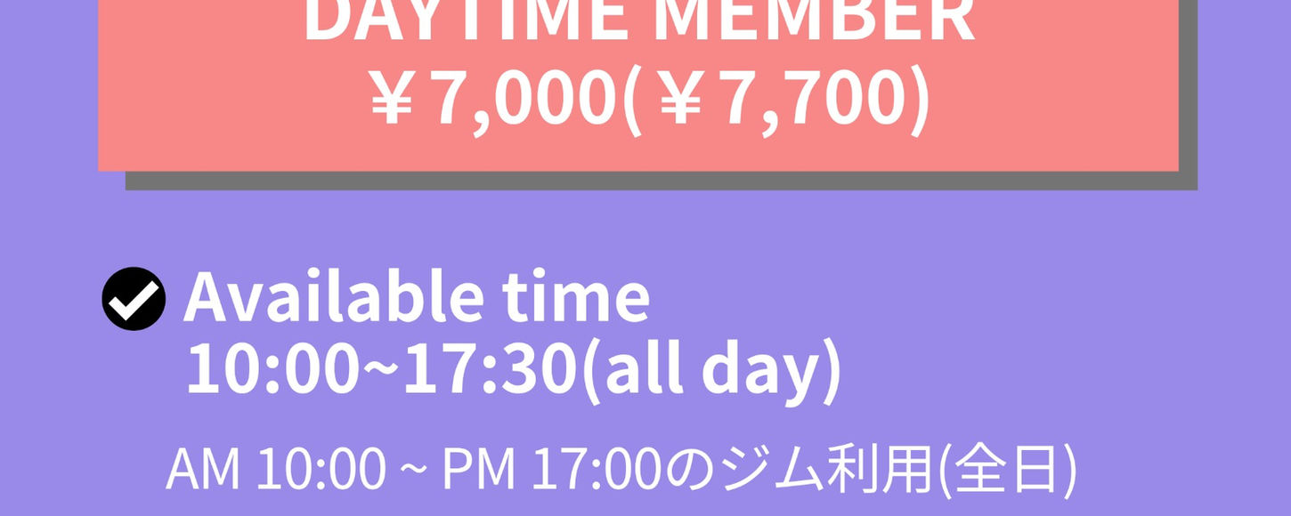 ●入会金無料 ●ライトユーザーにおすすめ ●10:00~17:00間、4時間までジム利用可能 ●1ドリンクサービス(毎回)